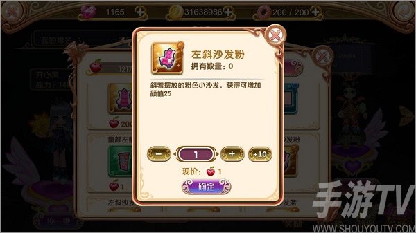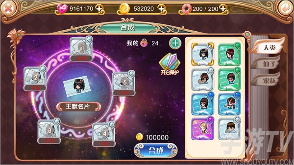 点击主界面的【合成】按钮可以进入合成界面,通过右侧可知该功能可以用碎片合成一部分的角色(包括人类、仙子)与家私,合成也是角色、家私的主要获得方式之一。