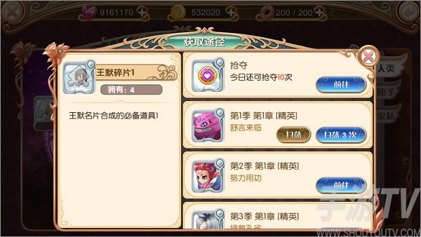此类碎片可副本获得,但掉落是有概率的,体力的限制下需要时间慢慢获得,而抢夺就是个更省时间的办法,点击碎片可以打开获取途径界面,其中有抢夺手段,点击前往。