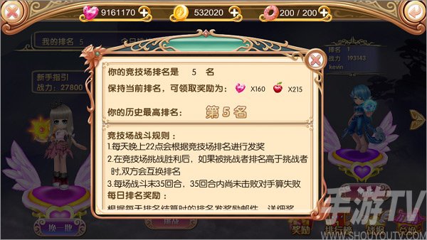 其中奖励内可以查询目前的排名与可获得奖励内容,竞技场的具体规则与不同排位奖励也可以随意翻看,排名前1000名玩家皆可获得相应奖励。
