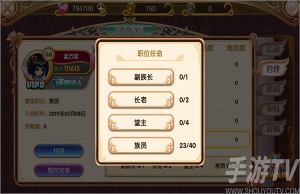每个家族可有1个族长,1个副族长,2个长老,4个堂主;