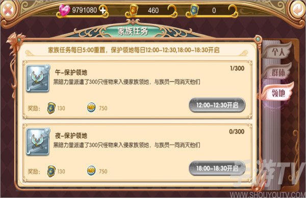 保护领地任务:每日12:00-12:30,18:00-18:30开启,需要成员一同抵抗侵略家族的黑暗怪物。