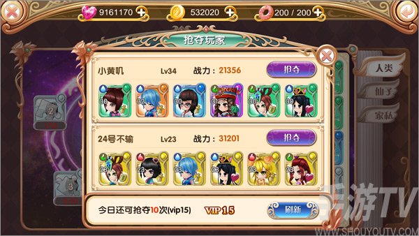 在抢夺玩家一栏下显示你可以抢夺的玩家队伍,以及与你VIP相关的次数,刷新可以获得更换可抢夺玩家,如果遇到战力过高的不如刷新看看。