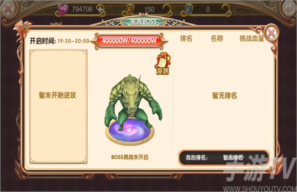 BOSS战开启后30分钟内家族成员可无限次攻击boss;