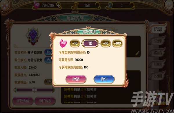 家族共10级,需要成员一同捐献钻石升级,捐献参与钻石消费活动;