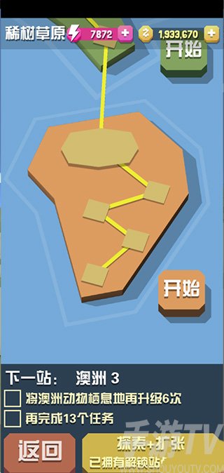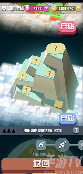 疯狂动物园有很多地图,每一个地图又分为五个关卡,每解锁一个关卡就会多一种动物,每个地图一共有七种动物。玩家有两个动物园,在屏幕左边的图标中有个火箭的标志,点进去玩家可以解锁侏罗纪公园,奥林匹斯山,还有长城等地图,地图风格还有动物都截然一新。