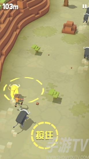 疯狂动物园的基本玩法很容易掌握,最初系统会给玩家自动骑乘上一头动物——野牛,进去地图后玩家会骑在野牛身上甩着缰绳(一直按着屏幕),看到头顶有new字样的动物就操纵野牛向新动物的方向移动,等距离差不多了就松手,玩家操控的人物就会飞出去,地上出现一个圈圈里面有个hold,当动物进到圈里面动物会发光,这时候点击屏幕就能抓到动物!