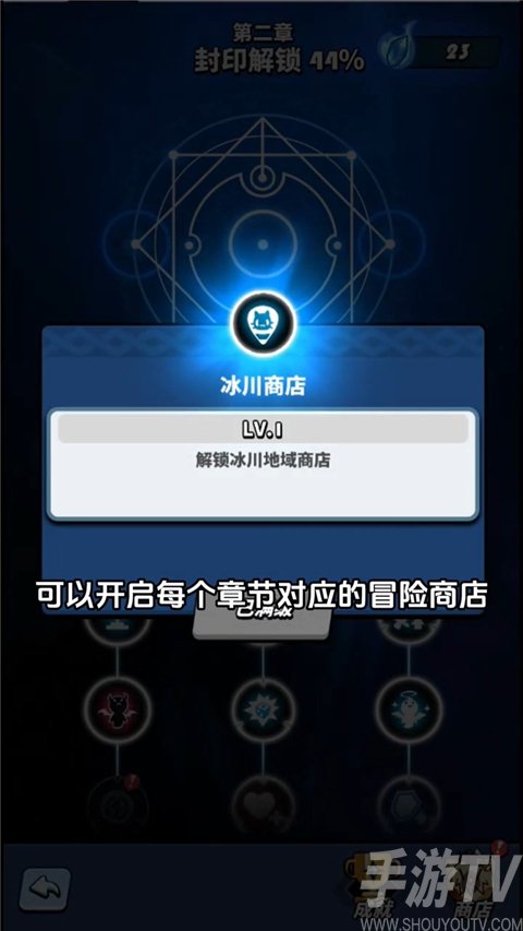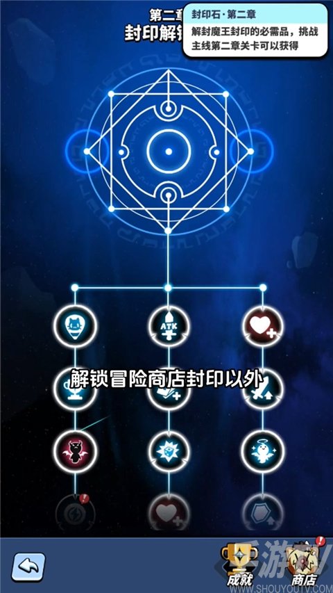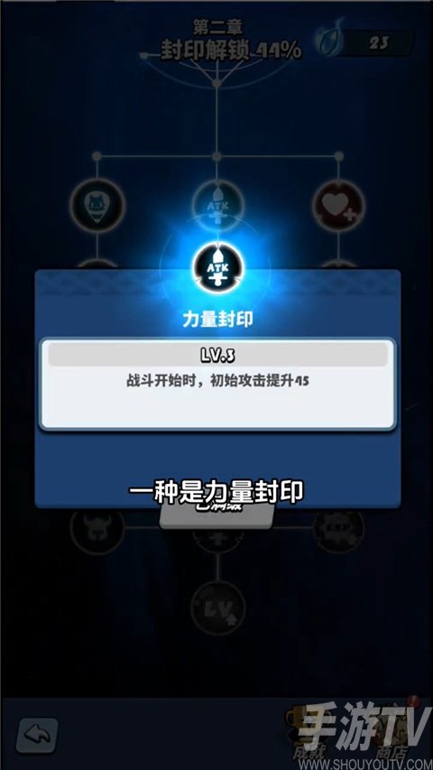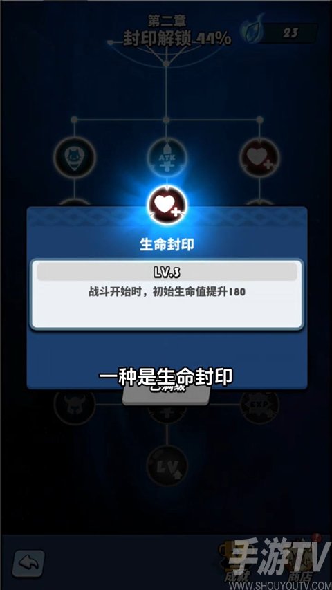 4、以第二章为例,我们除了第一排左边为教程解锁冒险商店封印以外,这里还有两种封印可供解开:一种是力量封印,解开以及后续升级可以提升初始攻击力,一种是生命封印,解开以及后续升级可以提升初始生命值。