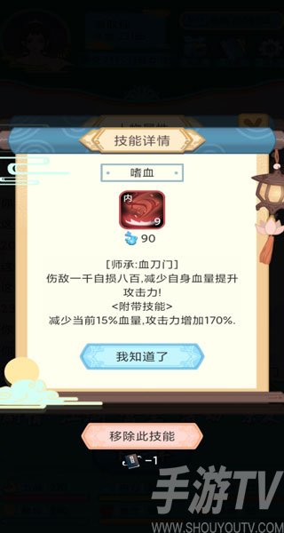 1、如少林掌门戒色,首先,用血刀斩给他挂一个流血效果。