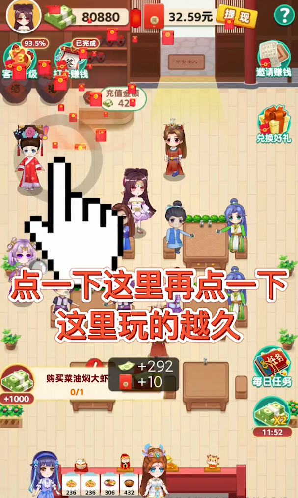 3.这是必吃的美食游戏,偶尔还会下红包雨。你可以随时得到它们。