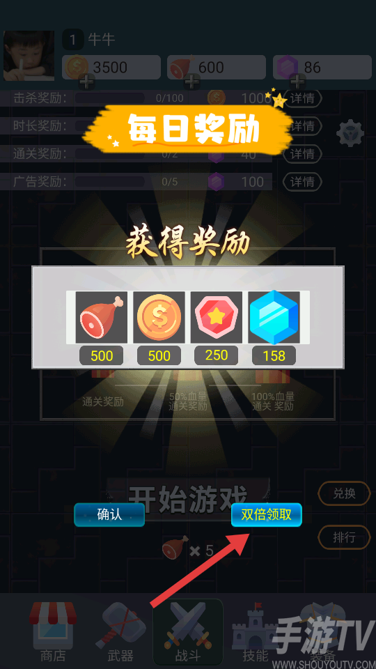 1、进入游戏先领【每日奖励】,点击【双倍领取】获取更多资源如500肉、500金币等,增强初始实力。
