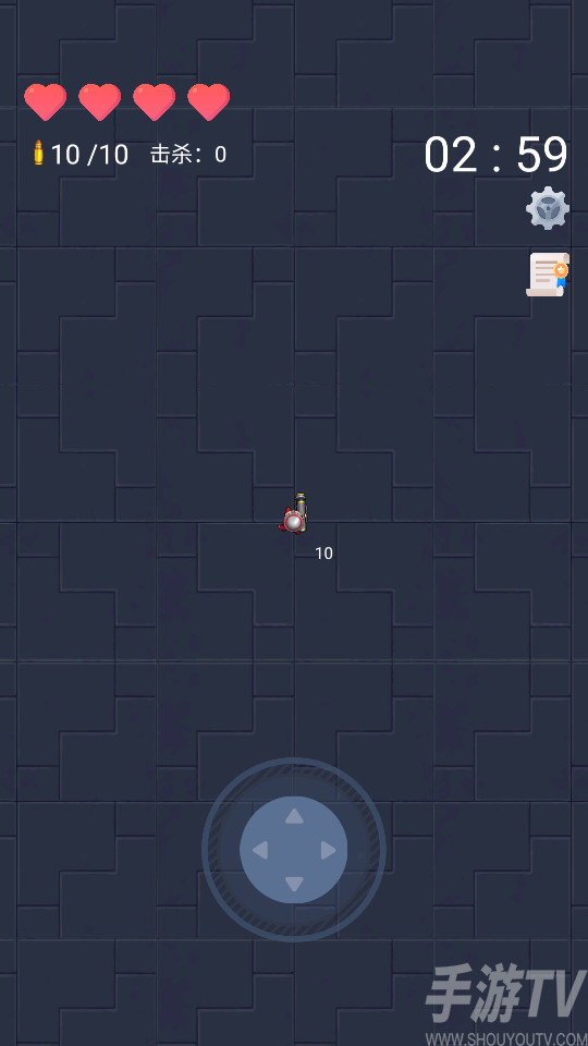 3、游戏内注意屏幕上方【爱心】血量、【子弹数10/10】,操控角色移动,在【02:59】倒计时内完成击杀任务。