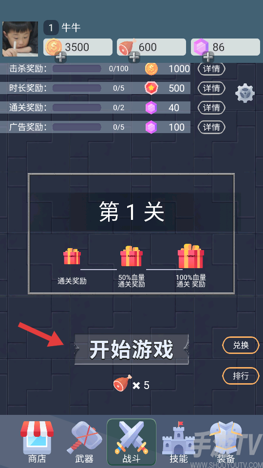 2、点击【开始游戏】进入【第1关】,了解关卡奖励规则,争取高血量通关拿丰厚奖励。