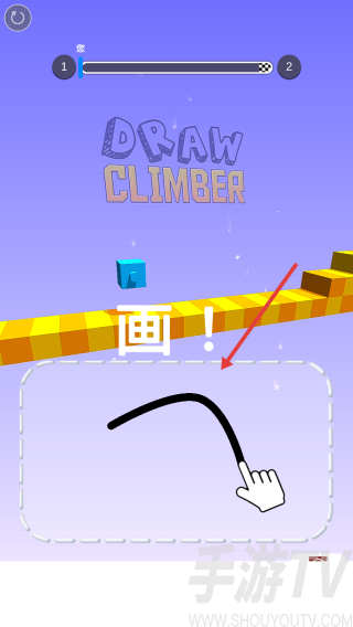 2、根据游戏提示【画!】,在指定区域内绘制合适图形帮助角色前进。