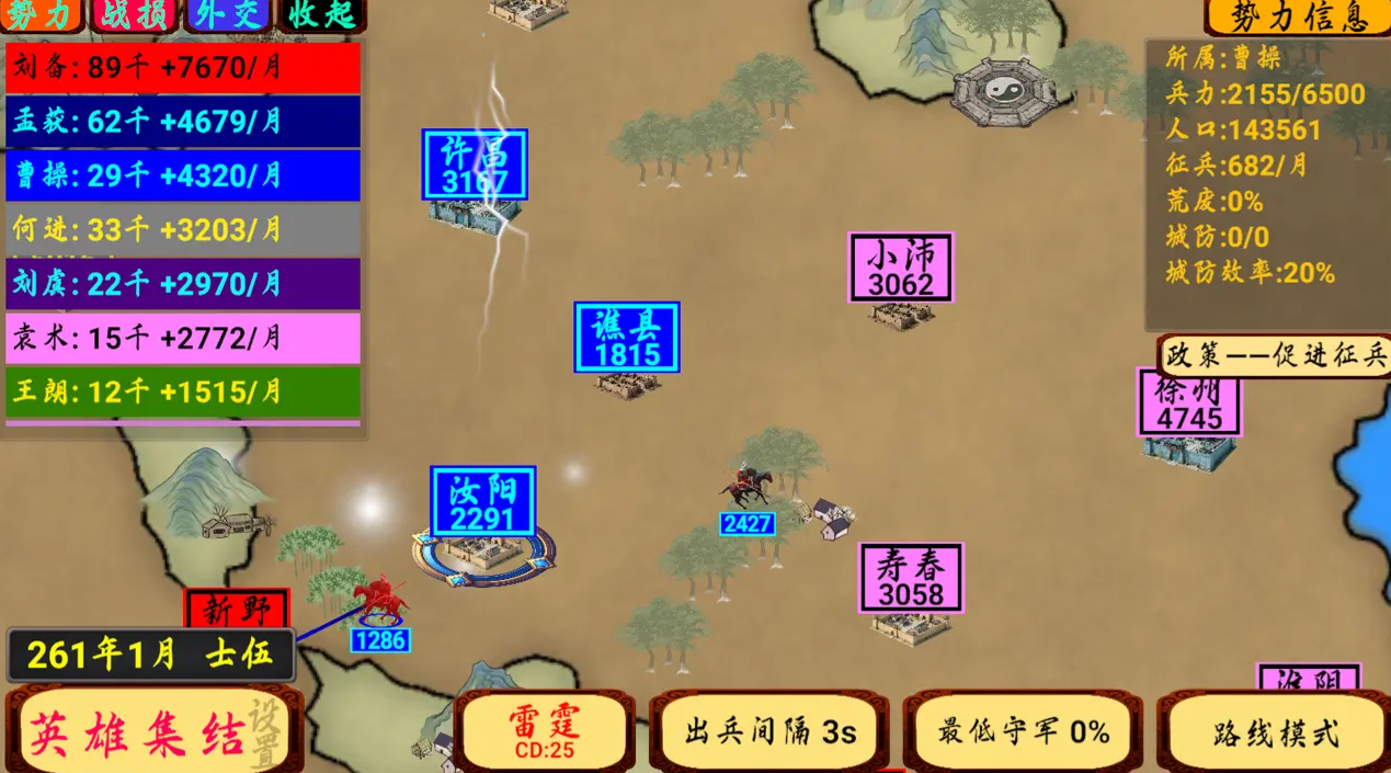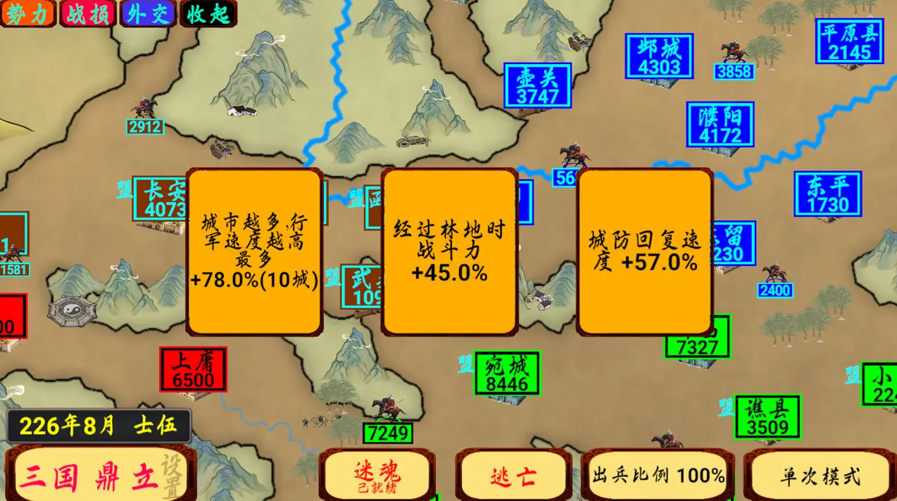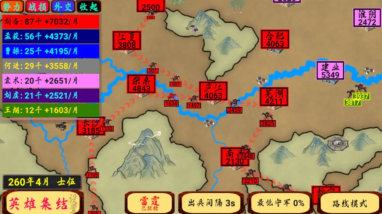 《指划江山》以其简洁的操作和丰富的策略性,为玩家带来全新的三国体验。画线指挥的创新玩法让游戏充满趣味,而丰富的社交系统则增加了游戏的互动性。自由征服模式开局可以和比自己兵力少的势力结盟。当攻击势力的宿敌时可以提升关系。