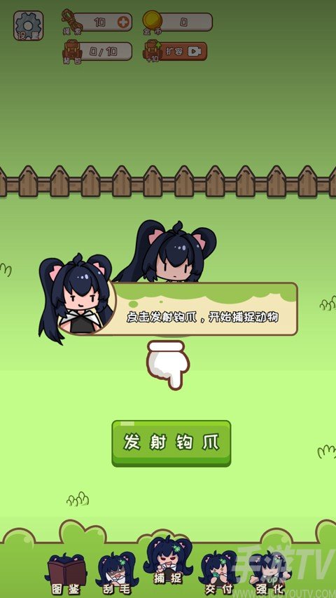 1、打开刮毛模拟器手游,游戏开始前会有个新手教程,跟随引导点击发射钩爪;