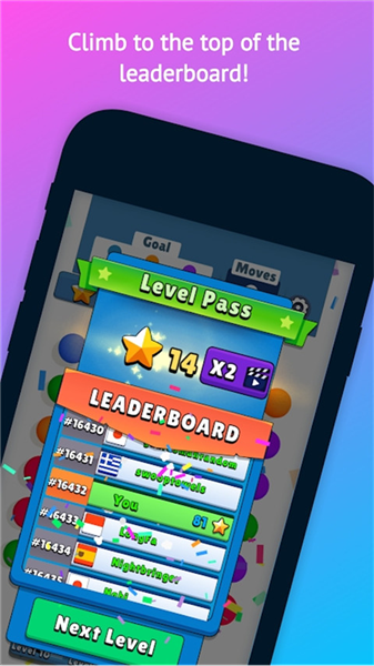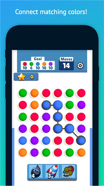 2、通过将关卡里相同颜色相邻的圆球用线连接起来进行消除,连线越长消除后的积分也就越高
