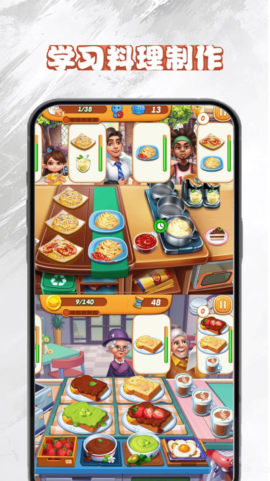 4、为了在既定时间内实现既定目标,多种紧张感的烹饪关卡模式,包括一定数量的客户、一定的销售额、赢得足够的赞誉等。