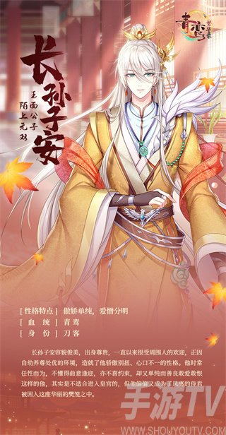 角色经历:长孙子安容貌俊美,出身尊贵,一直以来很受周围人的欢迎,正因自幼养尊处优的环境,造就了他骄傲别扭、心口不一的性格。他时常任性而为,不懂得曲意逢迎,亦不喜约束,却又单纯而善良、敢爱敢恨。这样的他其实是不适合进入皇宫的,但他偏偏又成为了凤离的侍君,被困入这座华丽的樊笼之中。
