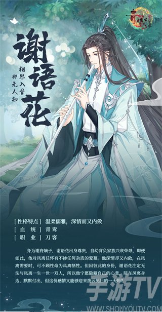 角色经历:身为谢府嫡子,谢语花出身尊贵自幼背负家族兴衰荣辱,即便如此,他对凤离怀有不掺任何杂质的爱慕。他深情却又内敛,在凤离需要时,可不顾性命为凤离牺牲。但因彼此的身份,谢语花注定无法与凤离一生一世一双人,所以他宁愿隐藏自己的心意,陪在凤离身边,默默付出,但这份感情又能够迎来拨云见日的一天吗?