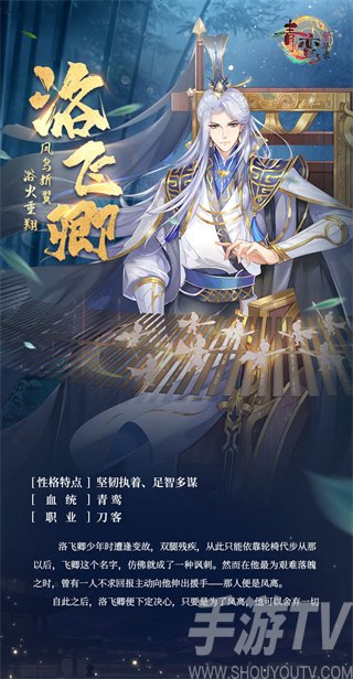 角色经历:洛飞卿幼年时遭逢变故,双腿残疾,从此只能依靠轮椅代步。从那以后,飞卿这个名字,仿佛就成了一种讽刺。然而在他最为艰难落魄之时,曾有一人不求回报主动向他伸出援手—那人便是凤离。自此之后,洛飞卿便下定决心,只要是为了风离他可以舍弃一切。事实证明,洛飞卿的确实现了他的诺言。为了凤离,他不惧危险,潜入朱雀国,在青鸾国被大军围困之时,他用过人的智慧与谋略,与凤离里应外合,成功令朱雀国退兵,后又全身而退,回到风离身边。凤鸟虽一时折翼,却终能浴火涅槃翱翔九天,这也是对飞卿一名,最好的诠释。