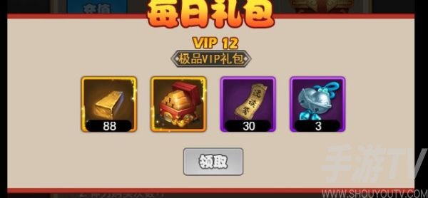 这个也是每个玩家每日必须领取的。如果是萌新玩家,那每天的量就比较少,只有5金条(蚊子再小也是肉呀喂!)。本着积少成多的原理,建议0氪的玩家还是要每天坚持领取!冲到了VIP1的话是可以VIP每日礼包是包含了20金条的。