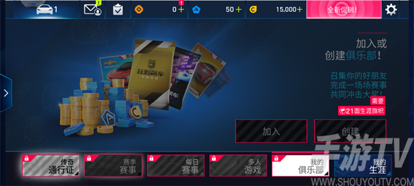 每日赛事也是一个获取金币的重要玩法。在这里分为速度赛事和活动赛事两种获得金币的方式,速度赛事的奖励有两种,一个是单人奖励,当比赛时间达到要求就可以获得金币;另一个是俱乐部奖励,当俱乐部成员完成赛事并且达到规定时间和人数后,也可以拿到相应奖励。