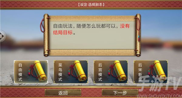 二、模式分为:自由模式、菜鸟模式(暂未开放)、后宫模式、后宋新皇;
