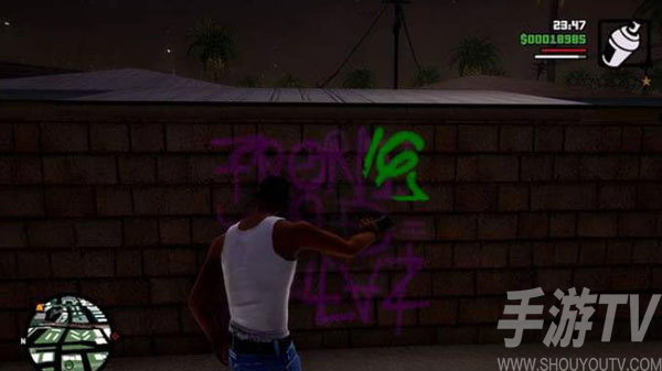驾车来到巴拉斯的地盘,右键瞄准,左键喷漆,将敌对帮派的标识覆盖掉。