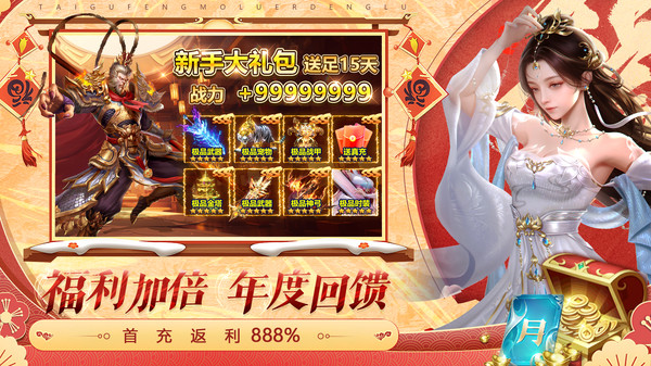 登陆壕送资源礼,在线即领超神装!资源找回全免费,极速升级超护肝!结盟爽战莽荒Boss,极品法宝超高爆!朝歌庆典,天界狂欢,限时宴会解锁珍宝!