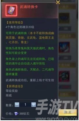 斗罗大陆手游中总共有10个武魂可供玩家选择,而每个玩家最多只能拥有5个武魂。这5个武魂如何互相配合,在团队中发挥出最重要的作用,是值得大家去思考的。或许在“斗魂场”中失败的原因,很大程度上就是因为武魂阵容配置的不合理。输出太多没有tank抗伤害,辅助太多没有输出也很容易完蛋。所以,武魂阵容选错的玩家,继续改变这种现象,就在想怎么转换武魂。转换武魂就需要“武魂转换卡”,就是如下图所示的东西。