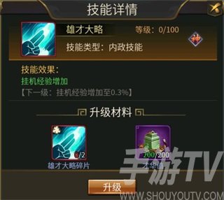 5、内政技能提供挂机收益的加成,包括挂机经验、子民、铜钱三种收益。值得一提的是,所有的阵法技能都是需要该阵法的阵法碎片升级,且阵法技能分为甲、圣、神、仙四种,越高阶的技能提供的加成也越多,所消耗的升级材料也越难获取。比如四书五经和雄才大略,在1级的时候就有0.1%的挂机经验之差。