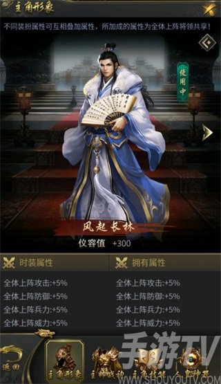 1、主公大人可以在主界面点击“主公”雕像进入主角界面,可以对主角的形象进行更换,主角形象可以通过晋级爵位、购买vip礼包、榜单奖励等多种方式获取,稀有的主角形象可以为主公提供各类属性加成