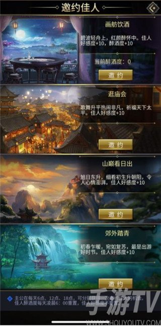 当主公在坊市中结识佳人后,可邀约佳人外出游玩描绘的佳人好感度。