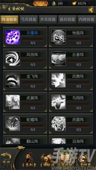 3、主角技能分为五大类:阵法技能、弓兵技能、步兵技能、骑兵技能、内政技能。