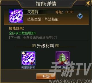 4、升级技能需要消耗对应的阵法碎片和才华值,且等级越高需要消耗的材料越多。以天覆阵为例,从0级升级到1级需要消耗2个天覆阵碎片和200点才华值,从1级升级到2级需要3个天覆阵碎片和400点才华值