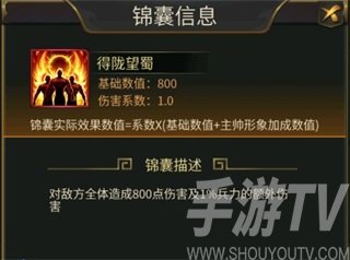 主帅战袍中,各类武器装备和锦囊妙计都会在国力到达一定等级时开启,每解锁一个武器都可以增加锦囊基础值。锦囊基础值会对锦囊妙计的效果数值产生影响,锦囊实际效果数值=系数×(基础数值+加成数值)