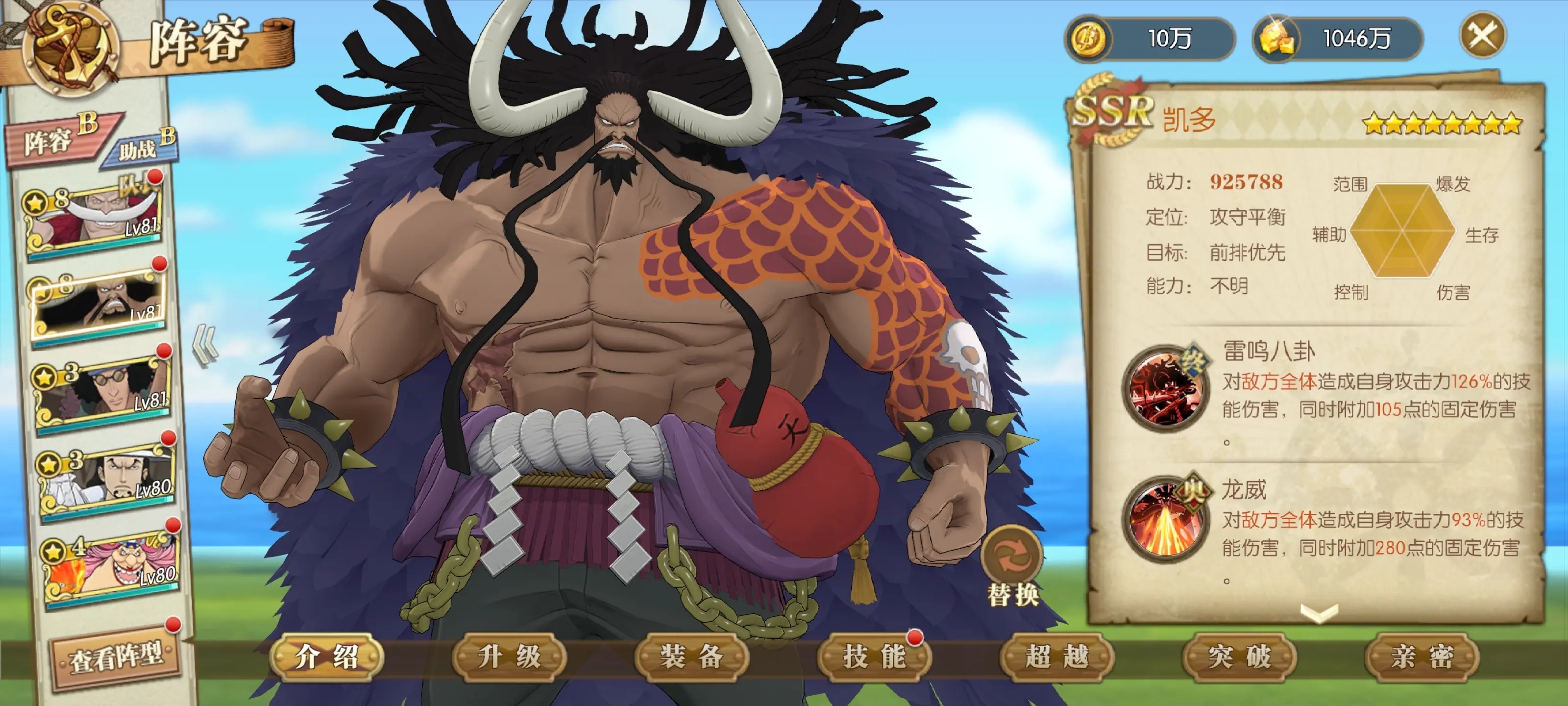 卡塔库栗虽然是最新限定但是出场表现比不上很多前辈,但是预见未来的锁血,枪术精通的必暴和伤害加成以及奥义的群晕和延展状态下附带的真伤也让其在在天梯中占有一席之地,算是现今PVP中的最强五人组的一员,相信如果大妈海贼团出卡成型快的话卡塔库栗还可以活跃一段时间。