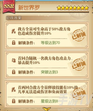 新世界罗由等级&突破解锁的助战效果对首回合的高速爆发角色有着极佳的帮助,这使得他们的输出在第一回合更易发生减员。由超越解锁的助战效果将对敌人的技能部署产生巨大的影响,这也为本方角色的逆境提供了翻盘的契机。