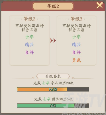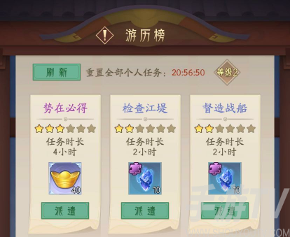 通过完成任务次数,可以提高游历榜等级,等级越高,随机刷新的任务星级越高,奖励就越丰厚。