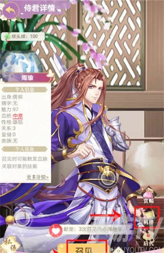2、选择之后,可以进行召见增加关系,再进行点击羁绊进行查看。
