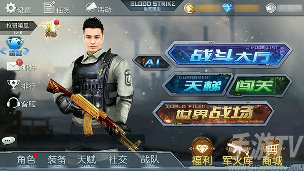 主界面最显眼的位置是玩家当前的游戏角色,占据画面的大部分,其次是位于角色右侧的战斗选择,包括战斗大厅、天梯联赛、闯关模式等选项。游戏系统被分布在了画面的左侧与下方。左上角是设置、任务和公告栏。左侧与左下角是玩家的个人信息,背包仓库与交互系统,在这里可以查看个人数据,整理装备,添加好友、收发邮件等。右下角是福利、军火库和商城。