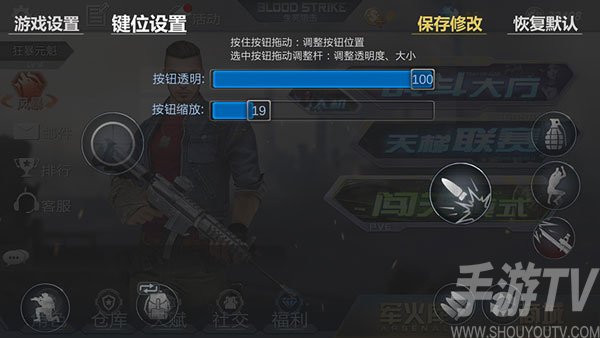 如果玩家不喜欢系统默认的操作方式,可以在键位设置里进行自定义键位设置。拖动按钮即可修改按钮的位置,还可以改变按钮的大小和透明度。