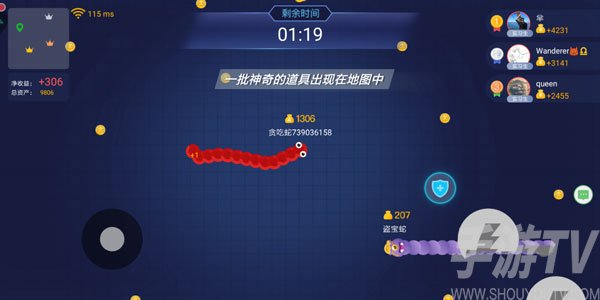 每局比赛中一共有十个玩家,一局时长为三分钟。玩家在收集欢乐币的同时也要注意别被其他玩家击杀,被击杀会失去所有已收集到的和本身投注的欢乐币。海盗蛇会携带大量欢乐币,要记得小心消灭对方。在游戏中还会随机刷新道具,要注意抢先下手。
