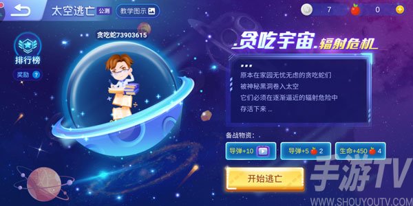 在太空逃亡中玩家可以体验一把在太空中进行游戏的感觉。在这种模式中,安全区域会逐渐缩小,活到最后是唯一的目标。一局游戏中共有29名玩家,安全区为绿色,辐射区则为红色。小蛇的头部在辐射区会受到持续伤害,要注意躲避辐射伤害进入安全区。