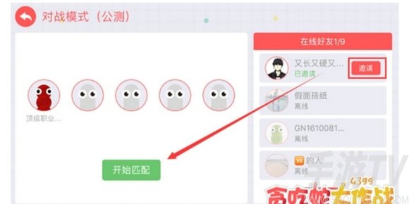 2、在对战界面点击开始匹配,系统会自动给你匹配对手,稍等一会即可进入联网对战房间,当然你也可以邀请自己的好友一起进入房间对战。