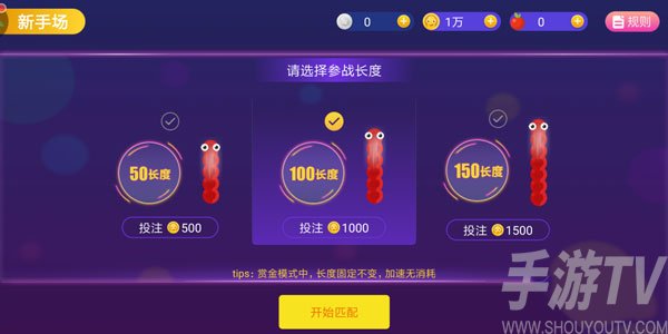 赏金模式的玩法是支付入场费进场,在支付入场费后选择参战长度并进行投注,长度和投注成正比。分别是50长度投注500、100长度投注1000、150长度投注1500。在赏金模式中,长度是固定不变的,使用加速技能不会对自身长度有消耗。