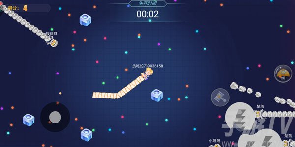 在游戏界面中,玩家的左手操作圈是用来进行移动和改变方位,右手边则是控制加速技能的释放和停止。加速技能的释放会消耗少量小蛇的长度,要注意控制技能的释放。