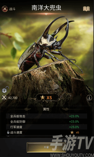案例:前期的战斗野怪选择南洋大兜虫对全兵种加成,培养到6-8星。后期单一射手兵种培养起来后,将绿巨螳螂提升到6-8星,再吃掉南洋大兜虫。(前期直接培养绿巨螳螂,非单一兵种收益低)