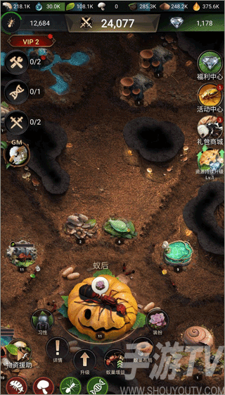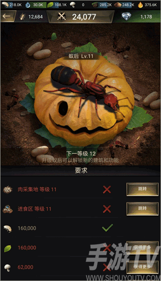 1、蚁巢地区限制条件:想要探索除去自己等级之外的更多蚁巢位置,就必须将蚁后的等级提升,而蚁后想要提升等级,就转化成了各种资源的获取以及仓库储存限制。这两个条件是相互转换的,说白了,想解锁更多的区域,你就得有这么多的物资。而新手引导结束之后,玩家们的主要目标也应该变成想法提高蚁后的等级,这样主要任务就转化成为尽可能多的在小小蚁国中获取肉,水,植物,沙子,蜜露等种种资源。