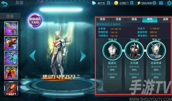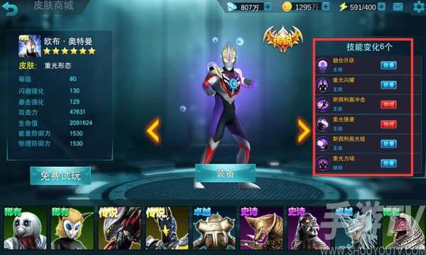 赛罗奥特曼无限形态皮肤:拥有皮肤之后,赛罗奥特曼可以直接从S等级变成SS等级,但是皮肤目前只能通过专属副本获得,所以难度还是有的。